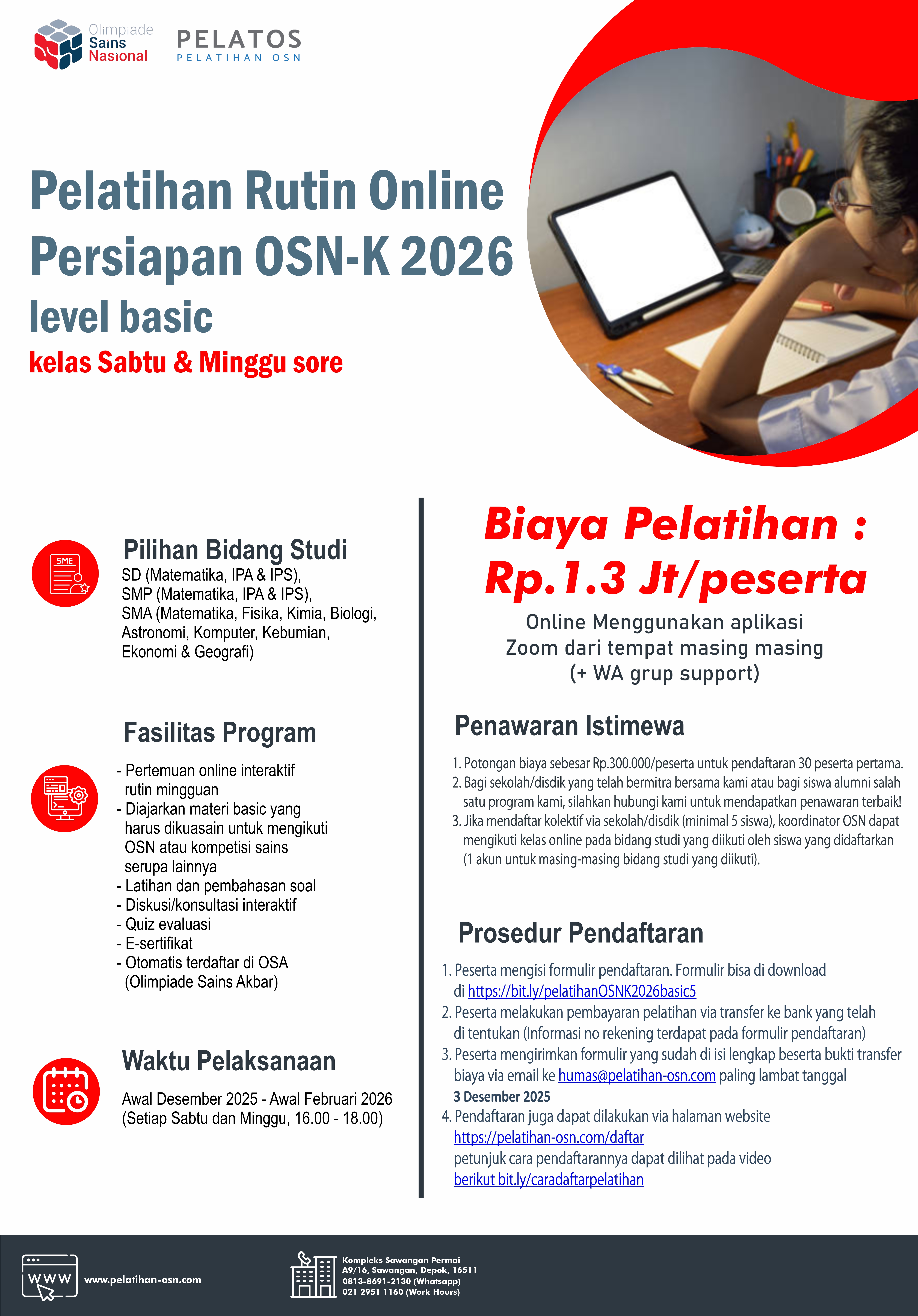 Dalam rangka persiapan awal menghadapi Olimpiade Sains Nasional tingkat Kota (OSN-K) 2026, kami membuka program Pelatihan Rutin Online Persiapan OSN-K 2026 tingkat SD, SMP dan SMA untuk pemula, berupa pembelajaran online interaktif rutin dan terjadwal yang dilakukan melalui aplikasi zoom. Peserta pelatihan ini juga akan otomatis terdaftar pada program Olimpiade Sains Akbar (OSA), yang dapat digunakan sebagai ajang uji coba kemampuan siswa sebelum OSN-K diadakan. Pelatihan ini ditujukan untuk pemula, sehingga akan diberikan materi basic yang kuat agar peserta lebih siap dalam menghadapi materi dan soal-soal yang levelnya lebih tinggi